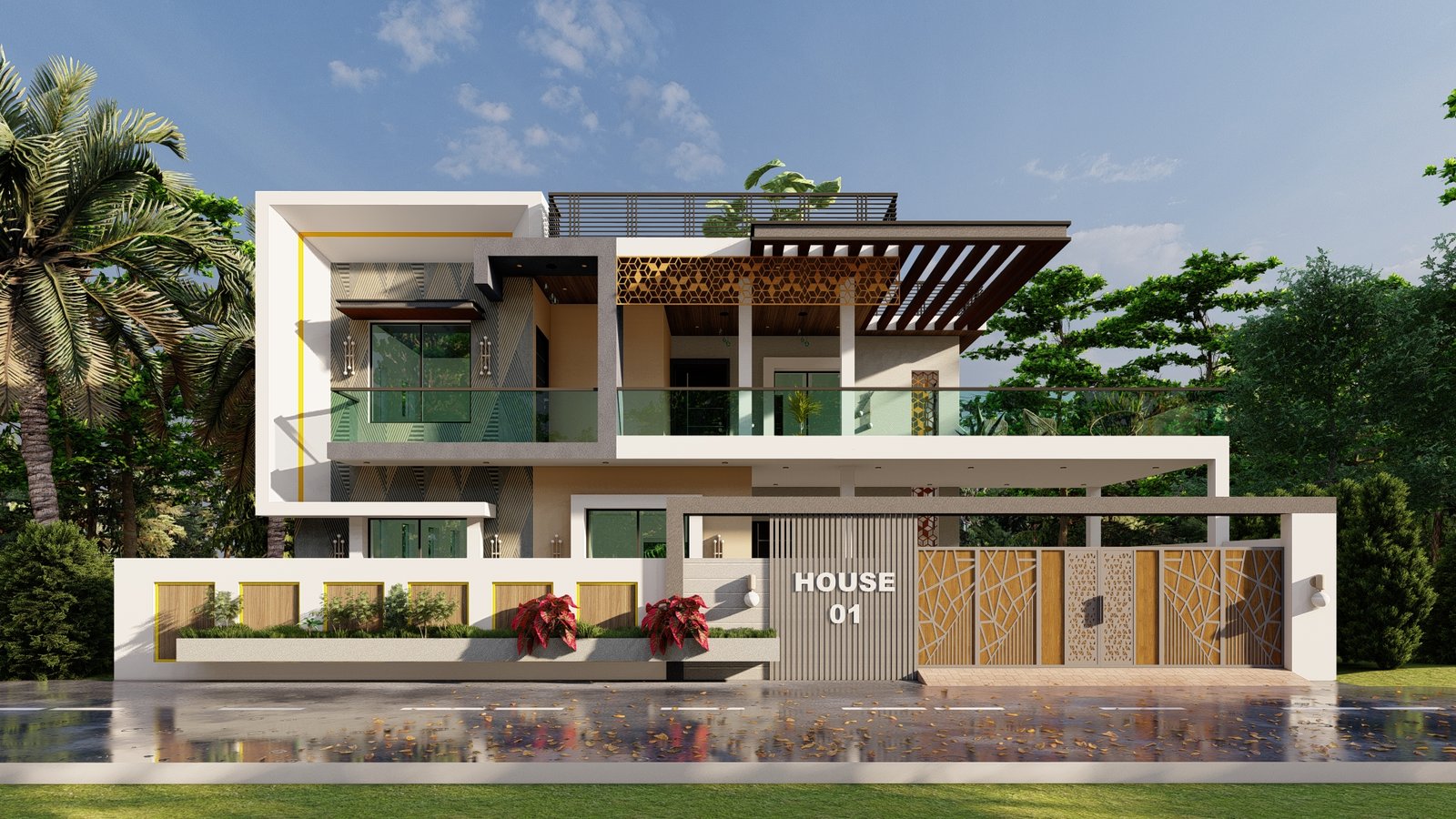 The 2968sqft(329.78 sq yd / 329.78 gaj / 13.19 marla / 275.74 sq m) or 53'x56' house elevation designmay provide details about the layout and construction of each story of the property. features such room and wall measurements, the location of the stairway, the electrical and plumbing systems, the door and window sizes, the layouts of the kitchen and bathroom, the ceiling conditions, the flooring, the structural features, and other unique situations pertaining to the 2968sqft(329.78 sq yd / 329.78 gaj / 13.19 marla / 275.74 sq m) or 53'x56' House Plans are frequently included.