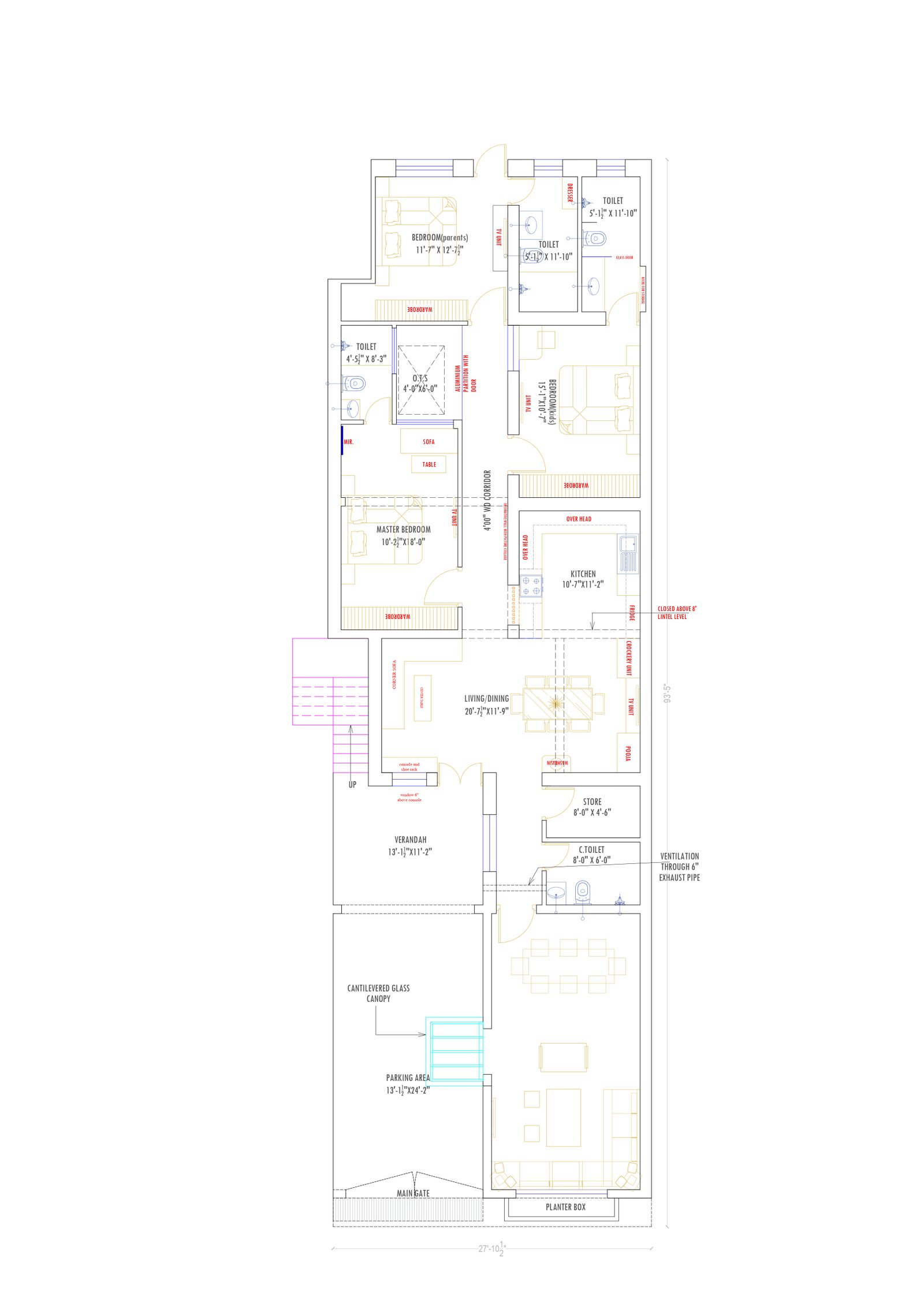 The 2784sqft(309.33 sq yd / 309.33 gaj / 12.37 marla / 258.64 sq m) or 29'x96' measurements provide for a multitude of floor design possibilities, catering to a broad spectrum of tastes. Plans with lots of open space are advantageous to homeowners since they facilitate mobility. Segmented designs can also include distinct spaces for work and leisure. The bedrooms, bathrooms, and storage spaces are arranged to optimize functionality while maintaining the greatest level of beauty.